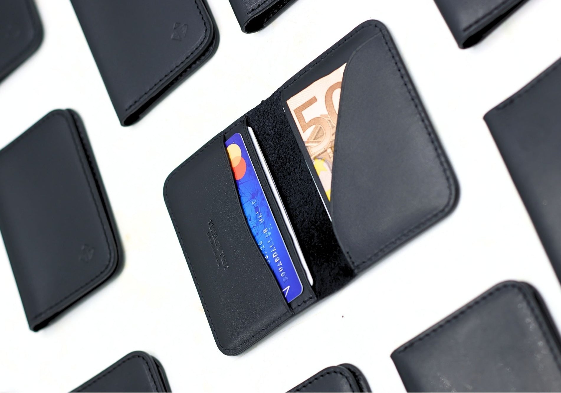A handcrafted wallet, slim enough to fit any pocket, holding up to 10 cards, bills, and essentials.