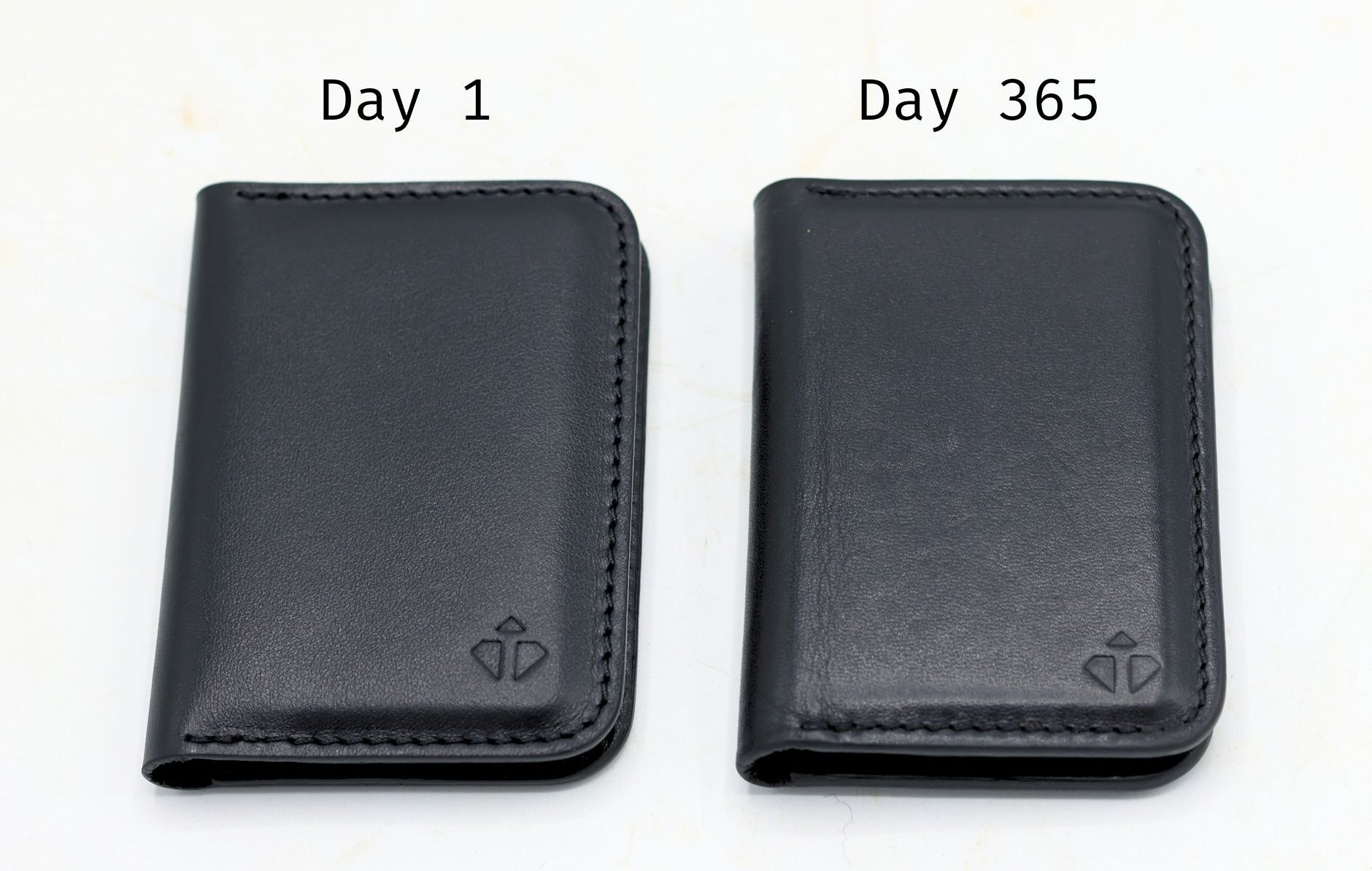 See how your wallet evolves over time — from the new leather of Day 1 to the rich, unique patina of Day 365.